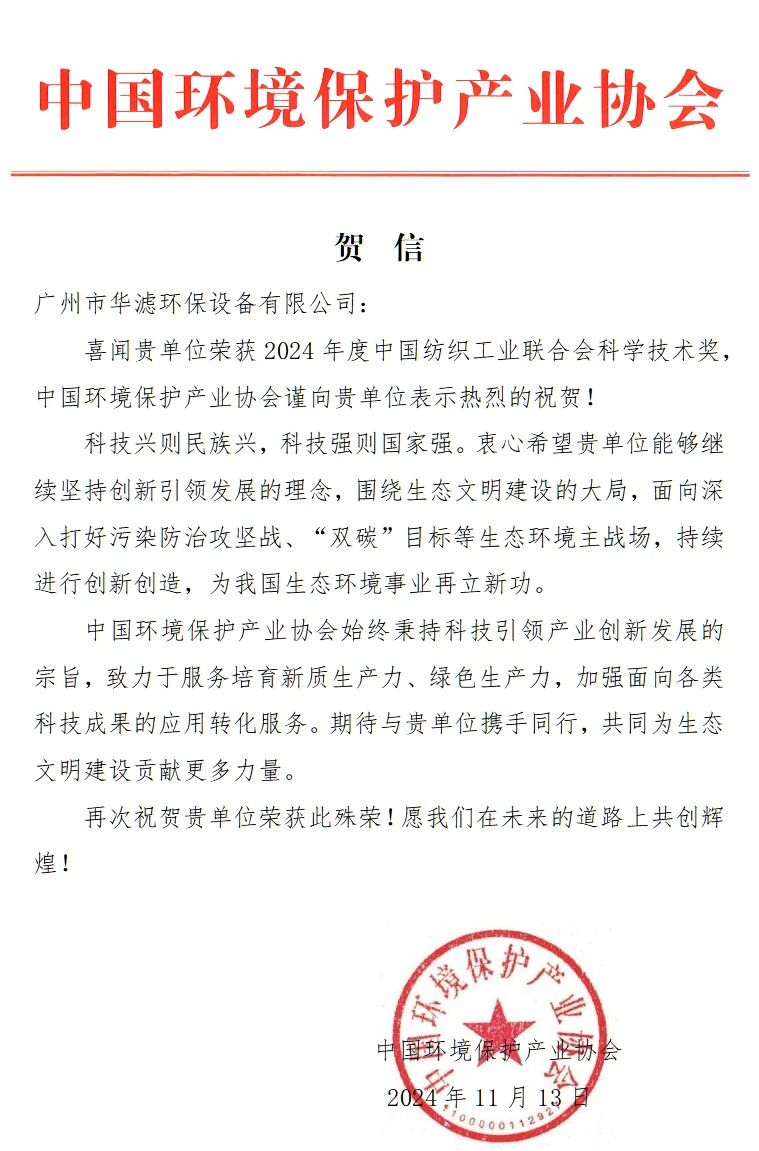 金年会環(huán)保衷心感謝中國環(huán)境保護產業(yè)協(xié)會發(fā)來的賀信,對“多工況下高效低阻復合長濾筒關鍵技術及產業(yè)化”項目榮獲科技進步獎表示熱烈祝賀,并鼓勵金年會·金字招牌誠信至上 |有限公司繼續(xù)秉持創(chuàng)新引領發(fā)展的理念,緊密圍繞生態(tài)文明建設的整體大局,面向深入打好污染防治攻堅戰(zhàn)和實現(xiàn)“雙碳”目標等生態(tài)環(huán)境領域的核心戰(zhàn)場,不斷推進創(chuàng)新創(chuàng)造,為我國生態(tài)環(huán)境事業(yè)的進一步發(fā)展再立新功。
