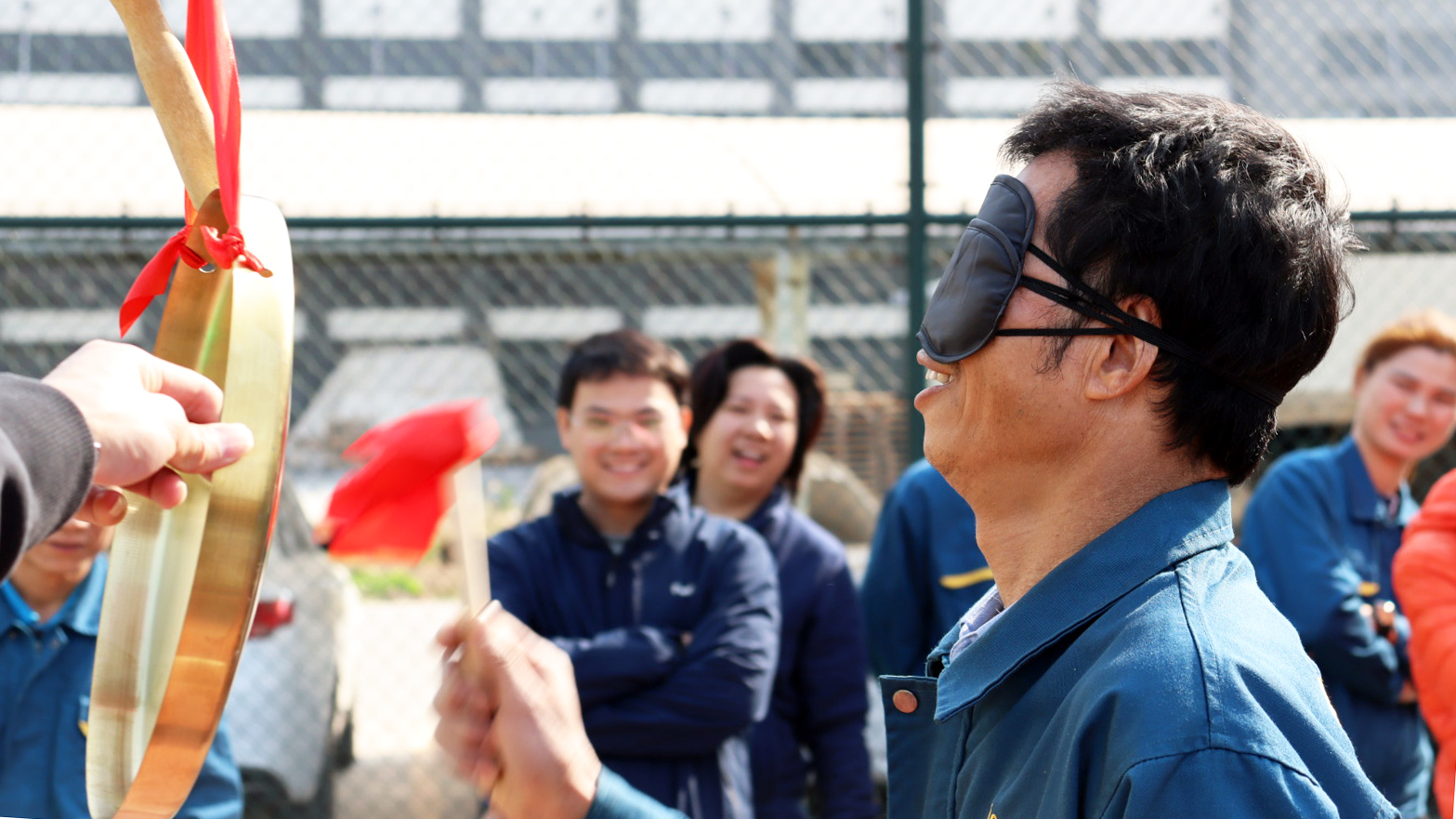 蒙眼敲鑼:考驗(yàn)選手的方向感與聽力,大家歡笑連連,氣氛熱烈。