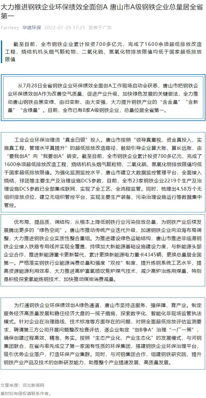 大力推進鋼鐵企業環保績效全面創A 唐山市A級鋼鐵企業總量居全省第一